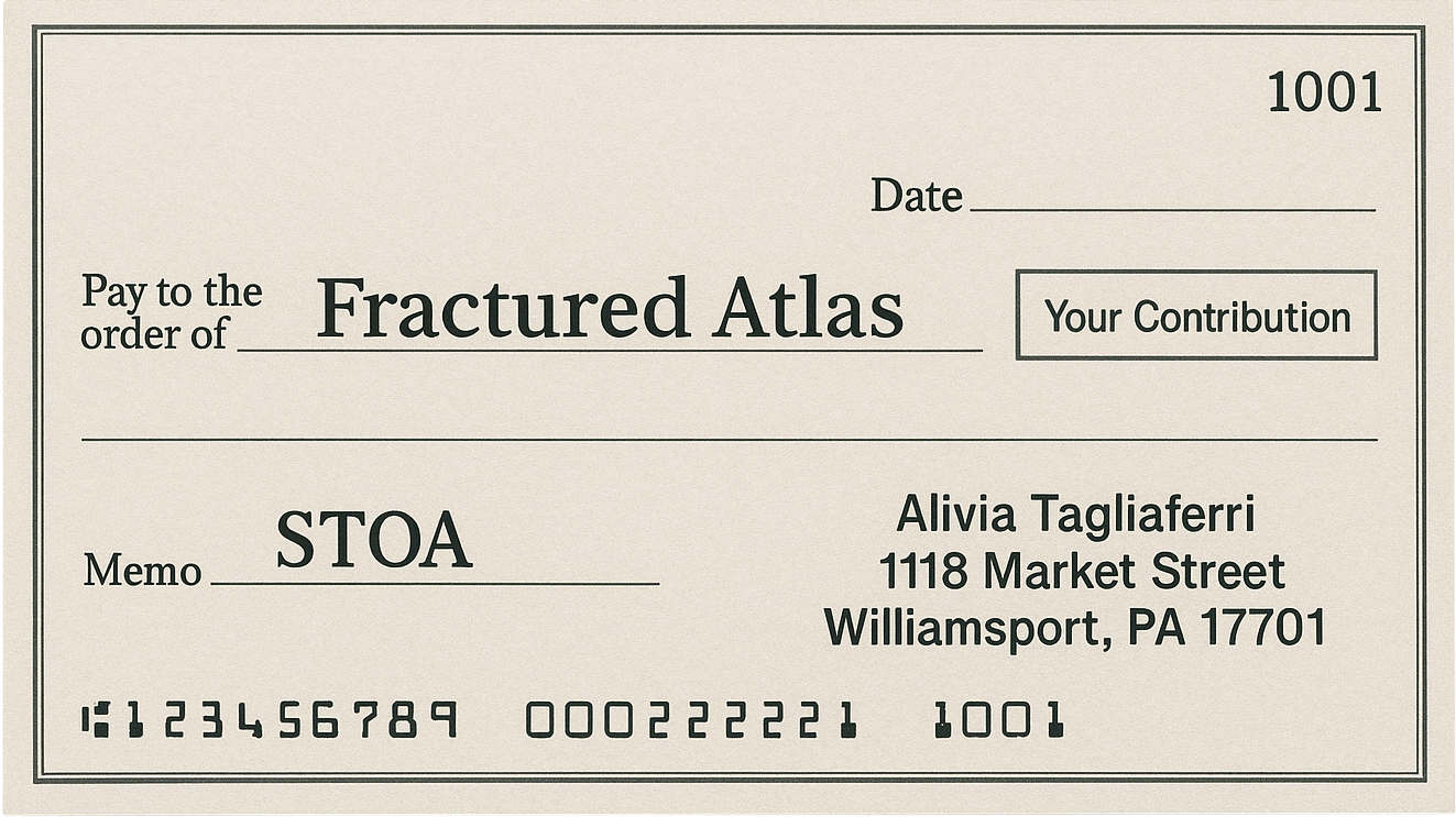 (Or go to FracturedAtlas.org and search STOA.)Give by Check: Make payable to Fractured Atlas; write STOA in the memo.